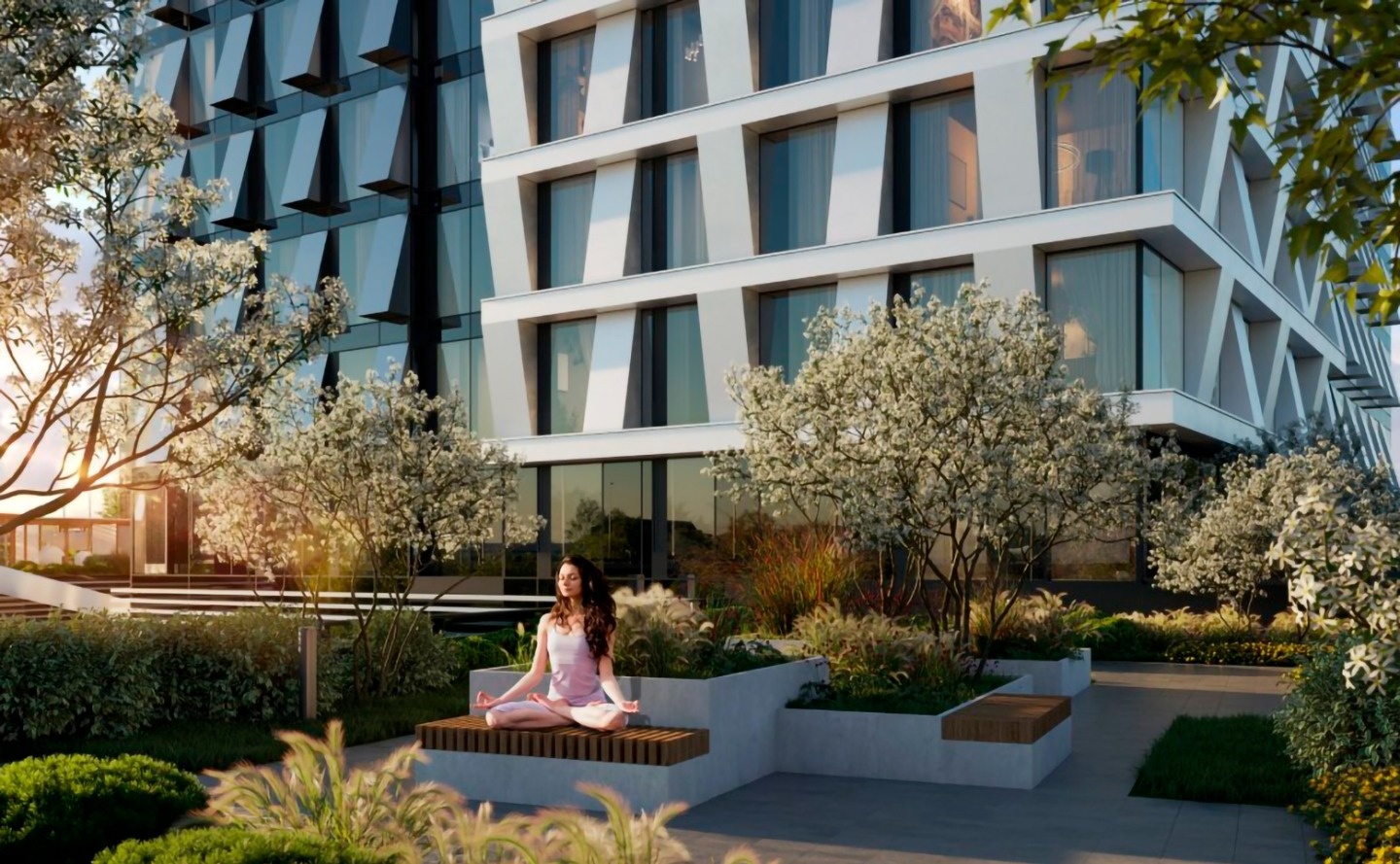 Под открытым небом расположится Lounge-rooftop. Озеленение и благоустройство периметра и внутренней территории создают дополнительные возможности для прогулок, детских игр и занятий спортом на свежем воздухе. Уникальная концепция проекта предлагает все преимущества современного бизнес-класса: круглосуточный консьерж-сервис, подземный паркинг, торговые и деловые центры, фитнес, бассейн и спа.