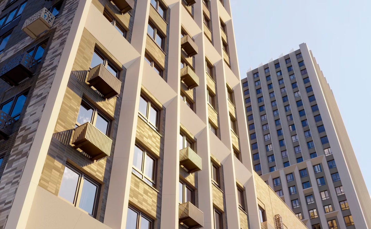 Жилой комплекс состоит из корпусов разной этажности: от 9-этажных секций до акцентных 100-метровых башен. Архитектурный облик комплекса разработан российским бюро «Крупный план». Фасады выполнены в спокойных тонах с преобладанием естественной палитры, в отделке первых этажей использована рельефная кирпичная кладка, верхние этажи украшает паттерн из металлических шевронов с бионическим рисунком. В лобби выполнена дизайнерская отделка с использованием предметов искусства и нестандартного озеленения. Витражное остекление обеспечивает приток естественного света. В каждом подъезде оборудованы колясочные, лапомойки и гостевые санузлы. На подземном этаже размещены кладовые помещения.