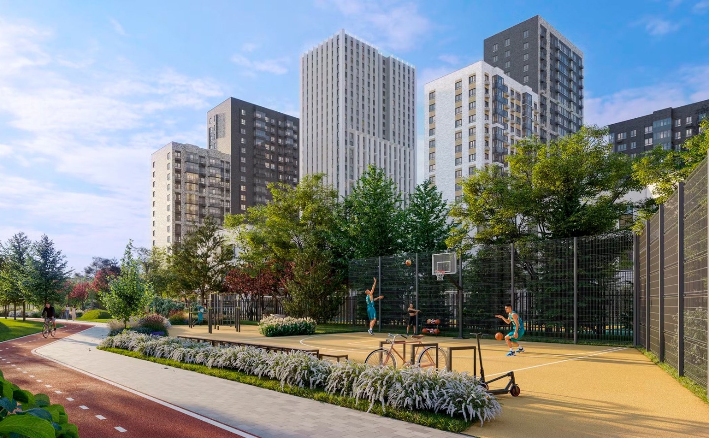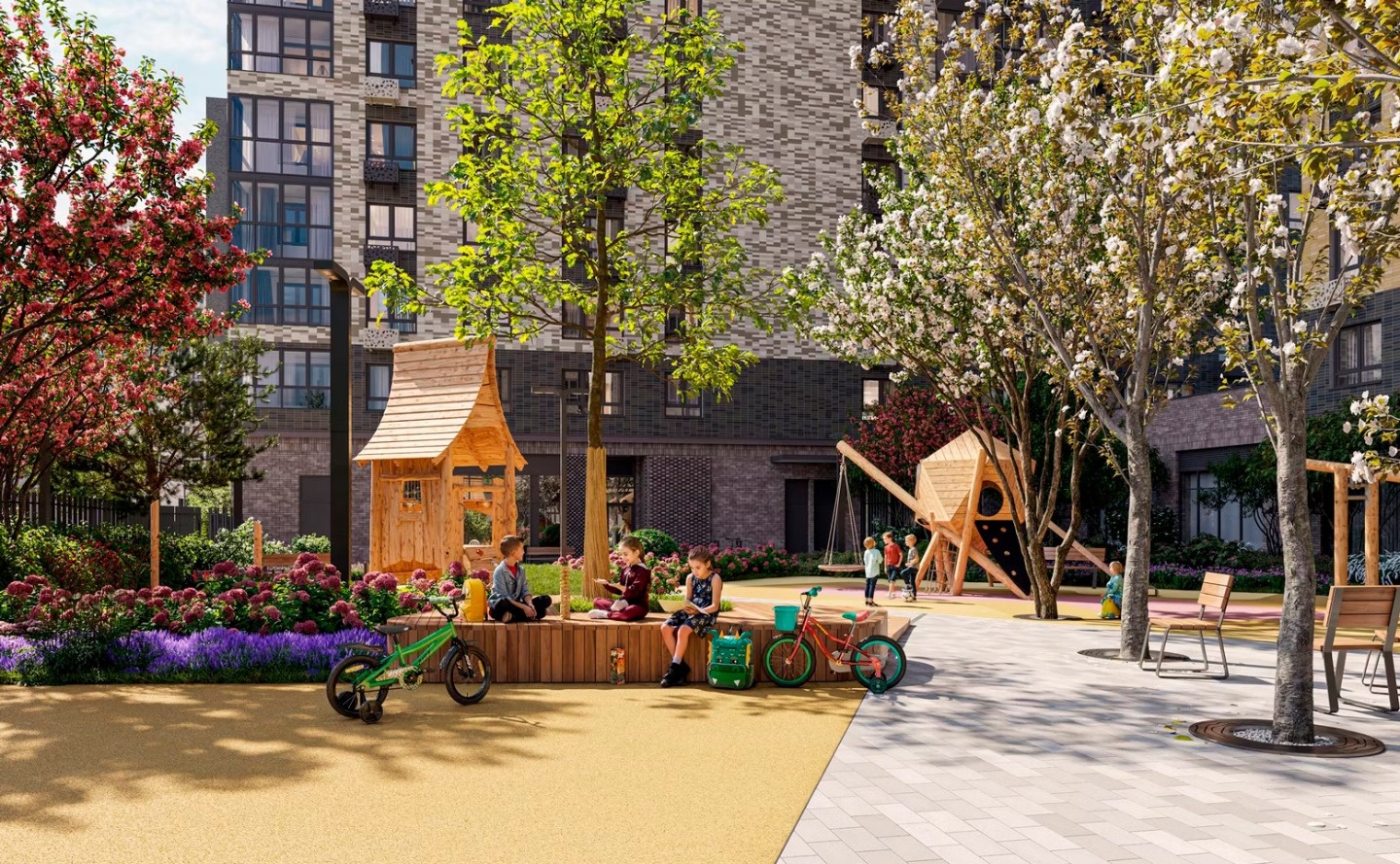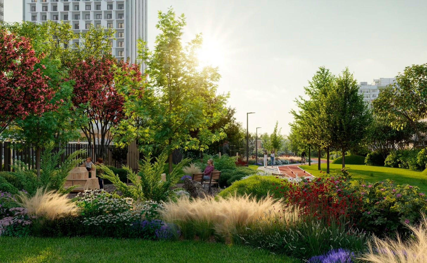 На закрытой территории комплекса, оформленной ландшафтным бюро «Вьюга» размещены: тренажеры на открытом воздухе, закольцованные беговые и велодорожки, пешеходные бульвары, детские площадки, разделенные по возрастам, детский скалодром, зоны для занятий йогой, спортивные площадки для тенниса, стрит-бола и рампа для роликов. Отличительной особенностью жилого комплекса является собственный исцеляющий сад. На первых этажах комплекса работают магазины и аптека, кафе и детский досуговый центр и фитнес-студия. Для владельцев автомобилей предусмотрен подземный паркинг.