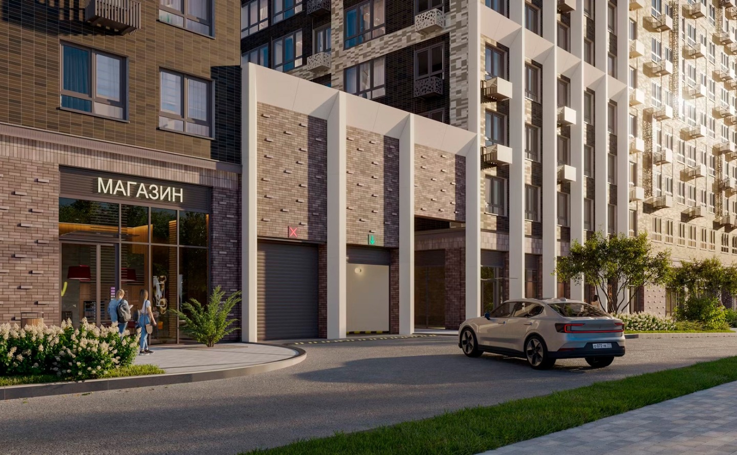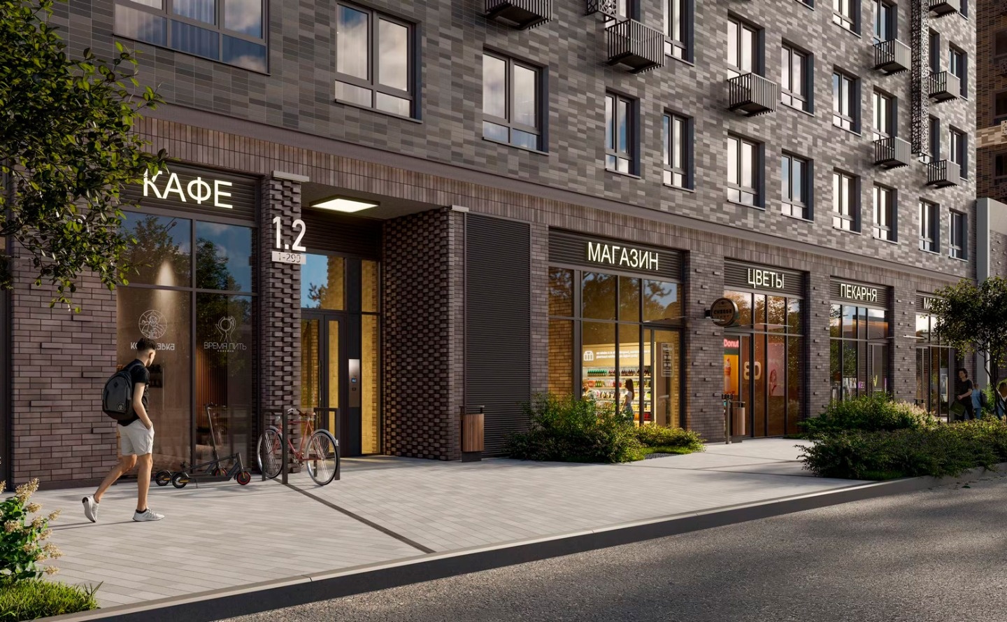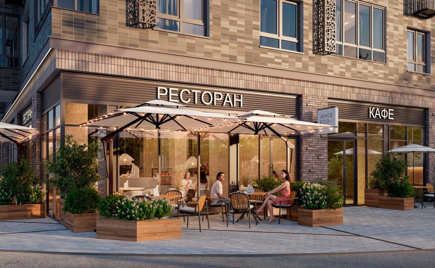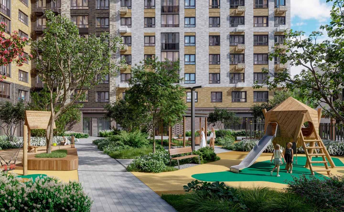 На закрытой территории комплекса, оформленной ландшафтным бюро «Вьюга» размещены: тренажеры на открытом воздухе, закольцованные беговые и велодорожки, пешеходные бульвары, детские площадки, разделенные по возрастам, детский скалодром, зоны для занятий йогой, спортивные площадки для тенниса, стрит-бола и рампа для роликов. Отличительной особенностью жилого комплекса является собственный исцеляющий сад. На первых этажах комплекса работают магазины и аптека, кафе и детский досуговый центр и фитнес-студия. Для владельцев автомобилей предусмотрен подземный паркинг.