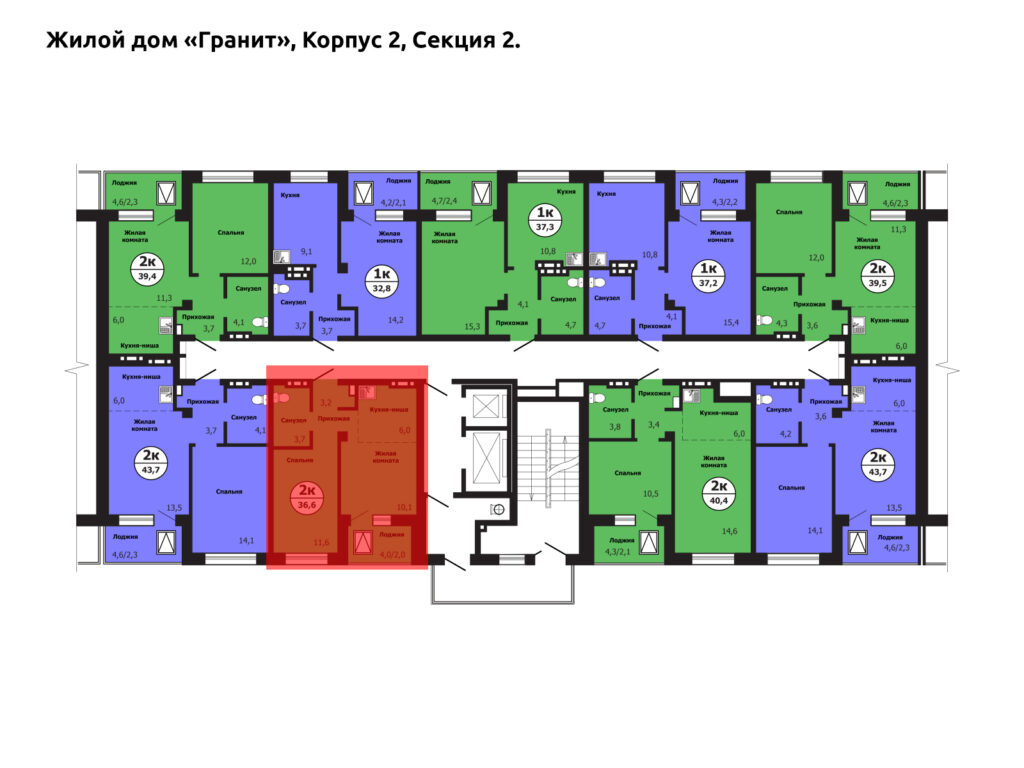 Дом «Гранит» состоит из двух 19-этажных корпусов и двух наземных автостоянок. Во 2м корпусе 3 подъезда на 432 квартиры класса «комфорт» площадью от 21 до 91 кв.м.