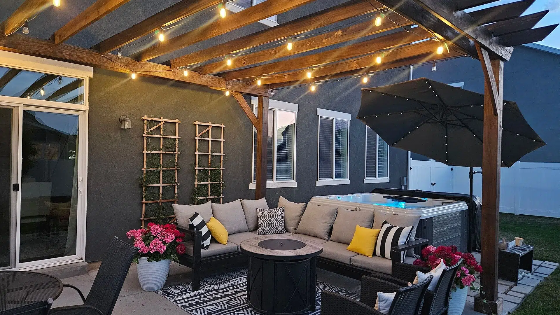 Для уголка отдыха идеальна южная или юго-западная сторона участка, но с возможностью затенения: с помощью перголы, текстиля, вьющихся растений или высоких деревьев. В оформлении сделайте акцент на мебели и эффектных деталях — встроенной подсветке вдоль ступеней или кадках с яркими растениями.